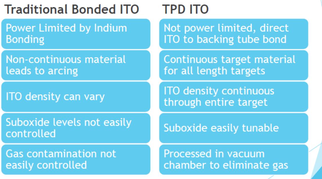 製法の特徴であるTPD(真空蒸着接合法)プロセスは、ボンディング製法の様に、インジウムを使用しませんので、そ の溶けのリスクがありません。TPD製法の場合、SUS等のバッキングチューブに直接真空蒸着接合されます。