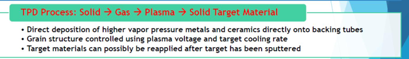 コールドスプレーは、溶射の一種ですので、ガスを巻き込みます。その 為、スパッタ成膜中にそのガスが放出され、コンタミになり得ます。一方TPD法 は、真空環境下で直接バッキングチューブへターゲット材を蒸着接合させますので、 基本的には不純ガスを巻き込みません。