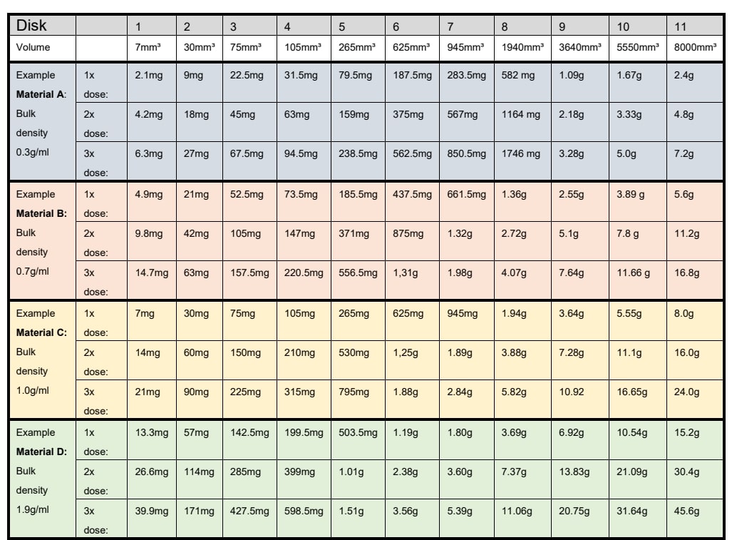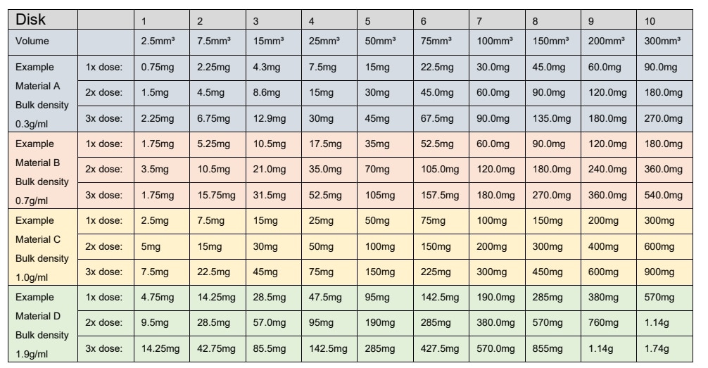 註1:もし適切なディスクがない場合、ご利用予定の粉末の、バルク密度と一回での希望分注量(体積もしくは重量)をご要望頂ければ、カスタマイズしたディスクをご提供致します。