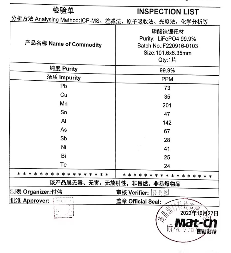LiFePO4 (リン酸鉄リチウム)スパッタリングターゲット