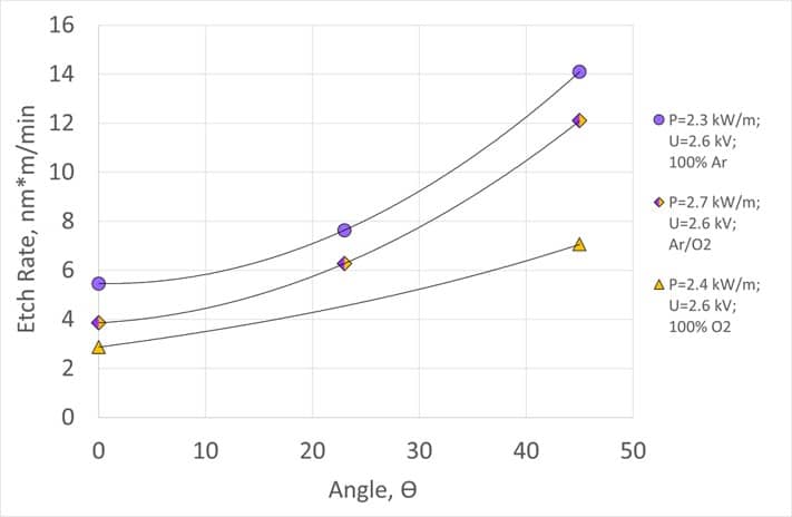 | 45度の入射角で最大のエッチレートを実現 | アプリケーションによってArにO2を混合 |