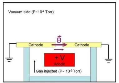ALISは、高電圧アノードと接地カソード間に形成されるExB場によって電子を閉じ込め、壁面との衝突でプラズマを生成。そこからイオンを抽出・加速します。